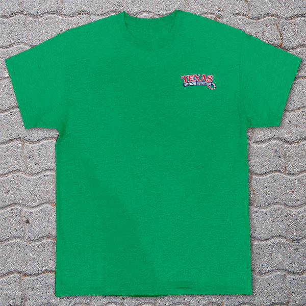 All of our shirts feature large, full color artwork on the back, and smaller logos on the front left chest. We use sublimation printing for our performance shirts, and premium simulated process screenprinting on our cotton and triblend shirts, for a soft handfeel.